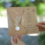 جنس پاکت کارت عروسی تأثیر زیادی بر زیبایی و کیفیت دعوت نامه دارد. در فروشگاه کارت عروسی برند انواع پاکتهای کارت عروسی با جنس های متنوع و باکیفیت برای سلیقه های مختلف موجود است. پاکت این مدل از کارت عروسی مقوای کرافت می باشد.