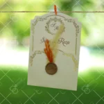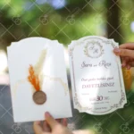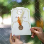 طراحی و دیزاین کارت عروسی نقش مهمی در زیبایی و جذابیت دعوت نامه دارد. استفاده از المان هایی مانند گل آرایی، طرح های برجسته، برش های خاص و ترکیب رنگ های متناسب، کارت را منحصر به فرد می کند. که دیزاین این مدل از کارت عروسی با مهر و موم طلایی رنگ طرح Love و گل خشک طبیعی رنگ نارنجی و کرم می باشد.