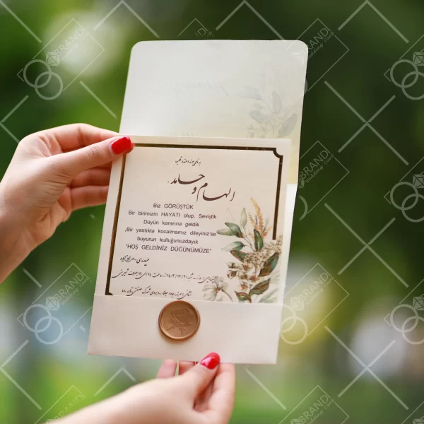 طراحی و دیزاین کارت عروسی نقش مهمی در زیبایی و جذابیت دعوت نامه دارد. استفاده از المان هایی مانند گل آرایی، طرح های برجسته، برش های خاص و ترکیب رنگ های متناسب، کارت را منحصر به فرد می کند. که دیزاین این مدل از کارت عروسی با مهر و موم طلایی رنگ طرح گل می باشد.